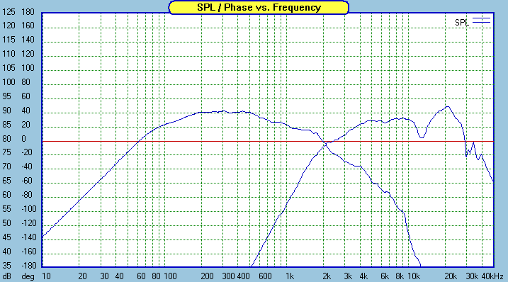 System response curves were taken with the port plugs in place. All the normal methods to acheive an accurate representation of anechoic response were used. A 200ms window nearfield on the low end was modified by a baffle step and diffraction simulation and then merged with a 10ms window semi-far field. The crossover frequnecy appears to be 2000 Hz, but tweeter 6dB down point is 3kHz and the woofer 6dB down point is about 1200 Hz. The woofer level is a few dB higher than the tweeter level. This all adds up to a lack of lower treble and a preponderance of midbass. Response is smooth, but quite innacurate. There will be even more droop in the response off the horizontal axis in the upper midrange due to the woofer's piston diameter based upper rolloff. In other words, power response will be equally bad or worse than the on-axis response.