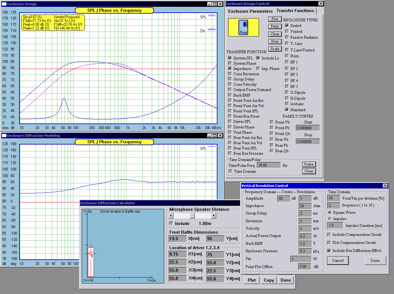 For a glimpse of the response in a couple listening rooms, I've taken some room responses. Mic was at tweeter height. The 1.5 meter response was taken in a typical setup in a small room with the front of the baffle about 2.5 feet out from the rear wall and 3.5 feet from the side wall. The 2 and 2.5 meter responses were taken in a medium to large room, 3 feet out from the rear wall and 4.5 feet from the side wall. One of the common response issues is the primary floor bounce resulting in a dip/peak combo at 300 and 600 Hz. In these conditions, the anechoic response can't really hide. The dip helps some of the excessive output between 300 and 500 Hz but it's still lots of bass below that and a lack of lower treble. The peak at 600 is less audible than it seems as I suspect (but can't prove) at that frequency our brains differentiate between direct and reflected sound. Room nodes dominate the response below 200 Hz, with the 1.5 m measurement having a lot of output (read: one note bass) near the port tuning. I do room response curves with all my designs but I don't always post them because they are of limited use. Everyone's room is different. However if you dig into the SR71, ZRT and L18 designs, you'll see some examples in there.