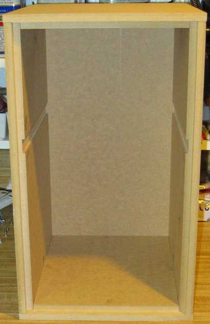 Here's a picture with the brace installed, the box side panels glued and the passive radiator installed. Don't be confused by the driver at the top. I set the front baffle on the top of the box to take the picture. It is just a straight-forward, typical box, but the whole point of this project was to keep it simple and see how much bang-for-the-buck one could extract from a set of drivers such as these.