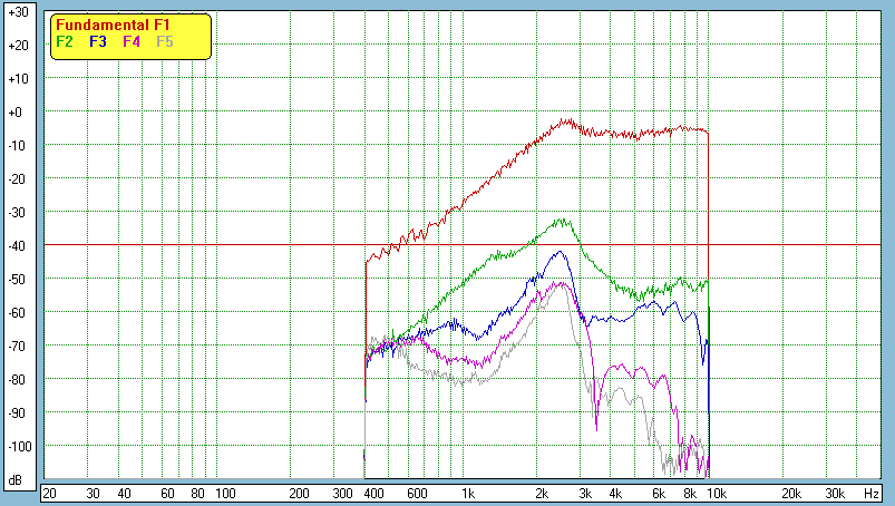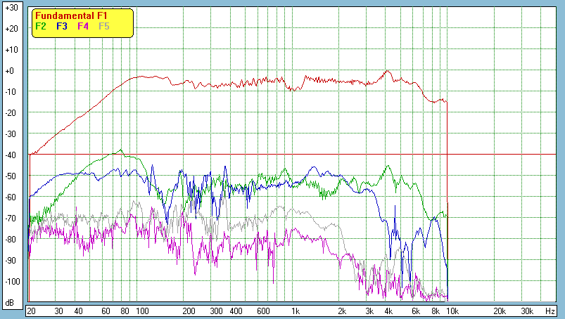 The harmonic distortion of the drivers is no surprise. The tweeter has issues down below 2.5kHz. The woofer is not too clean but less troublesome than the tweeter. Comparing to PE's other low end woofers, tall order harmonics are better than the DC160 for example, but not quite up to the DA175.