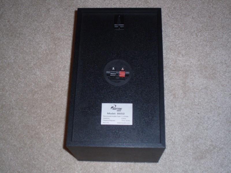 Starting with the looks, the system is decent and tasteful in flat black with a sharp looking grill and Dayton logo. From there it's downhill however. One speaker with grill weighs 5 pounds, not exactly inspiring confidence. Inspecting the enclosure, the sides and back appear to be approximately 3/8" MDF while the baffle is 1/2". The terminals are the cheapest made and they don't open well, making it hard to push in even small gage stranded wire. The drivers have very small magnets and appear to have simple construction. The woofer has some venting holes behind the spider, but no venting of the voice coil anywhere. The woofer has about 2.5 mm of one-way Xmax. There is a 1" thick piece of damping that covers the rear and sides. A single electrolytic cap is the tweeter crossover and the woofer is run full range.