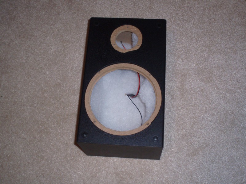 There are other things you can do to improve this system. The first would be adding some structural rigidity, by way of 4 internal crossmembers. The real trick is to avoid taking away any of the enclosure's volume, which would make the Qtc even higher. I recommend 1/2" hardwood dowels, no larger. 2 from side to side, one from top to bottom and one from front to back, positioned in the area between the drivers. Then add a good wad of additional stuffing, all around except the area directly behind the woofer.