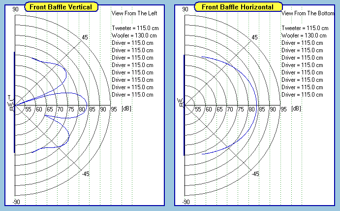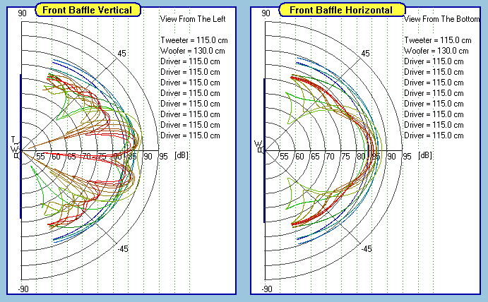The effective tweeter crossover point is very high, approximately 6.5kHz. The design axis appears to be halfway between the woofer and tweeter, since that is where the response exhibits fewer problems. This system has all the problems that normally result from a crossover point that is too high. Just a few degrees off the vertical axis and the response changes drastically for the worse. If you can stay on the vertical design axis however, 30 degrees off the horizontal axis helps tame some of the woofer's breakup node and reduce the system's mid treble level. I had to run the vertical polar simulation all the way up to 7 kHz to show the extent of the problems with this high crossover. This goes beyond what some people would consider "head in a vice" listening position requirements. There is no good listening position, only bad and worse.