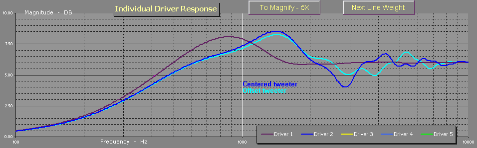 Centering the tweeter is a big design choice for this system. Many people prefer to offset the tweeter while some prefer it centered. The fact is, one is not better than the other, but it does make a difference in how you optimize the system. By nature, an offset tweeter on the baffle will have the smoothest response on axis while a centered tweeter will be a little rougher on axis but smoother off axis. You'll see why in the measured off axis plots below.