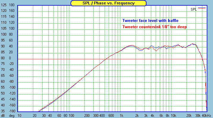 It would be important to note that I did not round over or chamfer the inside of the woofer hole. I do chamfer the inside on designs with smaller woofers that need a reduction in airflow resistance, but the Seas 7" woofers are well ventilated. All response plots for the woofer as shown in this design are with the precut baffle as supplied. This is partially a concession to those who would like to build the kit but do not own a router. Just be aware that I would not have not have let it go if the effects were obvious and audible. For those who buy the precut baffle and do have a router with a chamfer bit, go ahead and chamfer the inside radius. It's certainly not going to hurt the design, and will likely result in a tiny bit smoother response on the top end of the woofer's working range due to a small reduction in the inside edge reflection back through the cone.