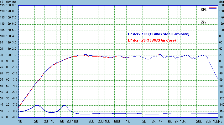 I used a Madisound Sledgehammer 15 AWG steel laminate for the primary woofer inductor. Note that using steel screws to fasten the inductor down through the 2 holes will increase the inductance by about .2 mh which is a bit too much for this design. If you would like to mount with screws, buy a 3.0 mH instead. Otherwise, use a non-conductive mounting method like zip ties. Those buying the pre-made crossovers from Madisound should not worry, the inductors are not screwed in. Those selecting their own components could use an Erse inductor, since the screw does not come near the core. Nice inductor design, but a bit expensive. If you are rounding up your own components, be aware that the low DCR of the steel laminate core isn't an absolute requirement. Just try to keep the impedance under aboout .7 ohms and the difference in the effect on the woofer will be minimal.