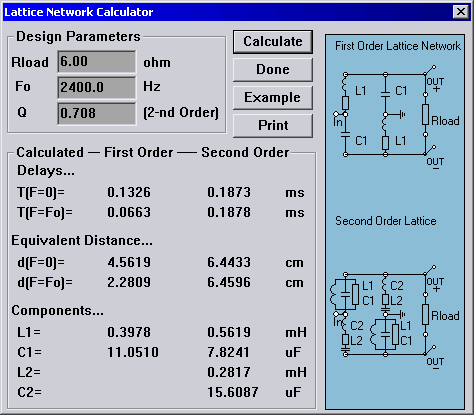 A ladder delay network is also known as an all-pass network, lattice network or phase control circuit depending on who you talk to or where you look. For these 4 components, (4,6,7,8) I started with some very rough values using the calculator inside Soundeasy. Note that the equation used there is simplified and therefore relatively useless for determining final values. It's good enough for determining a starting point. A first order ladder was used because a 2nd order is too complicated and presents much more phase shift than I need.