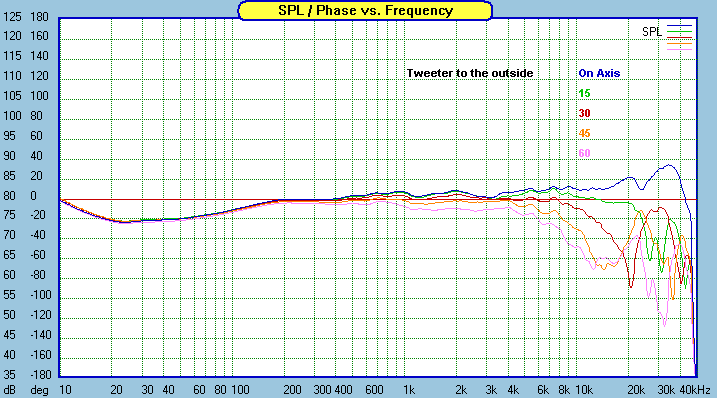 The measured off axis curves give you a little more insight into why I selected an on-axis response curve with a slight rise in the top two octaves. It flattens out almost perfectly a few degrees off axis. You don't have to have the tweeters pointing directly at you in this design. Generally it's not going to matter much if the tweeters go to the inside or outside, but I would lean towards tweeters to the inside. Off axis response through the crossover region is almost perfectly smooth.