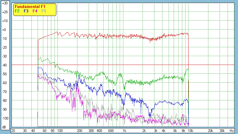 The system harmonic distortion plot is for reference only. It can not be directly compared to curves shown in my tests elsewhere because those are optimized for a testing of a single driver on an infinite baffle. But it does show distortion trends, and points out that there are no distortion issues in the crossover region, and the selected crossover frequency and slope was acceptable.