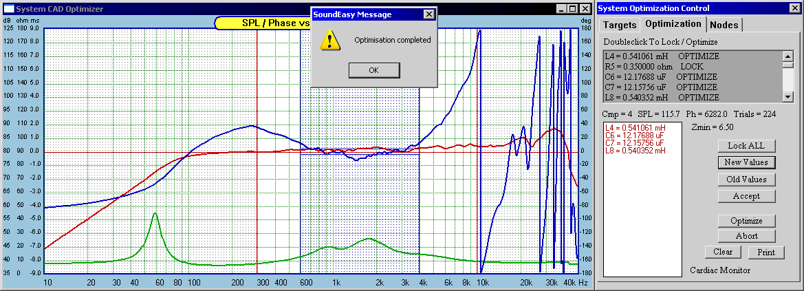 We're closer to done but not quite there. The rest of the optimization is done by hand. Changing values of individual components and then referring to the on axis response, vertical polar response, individual driver response and the reverse null shows us what the effects are. Move on to another component and repeat, revisting components as required. Reaching perfection from this point takes some time. After all the tweaking inside Soundeasy, some real listening may cause you to re-evaluate your design goals and head back to the drawing board. After some experience pushing out designs, the amount of real listening testing decreases as you learn how to reach your goals from within the initial design phase.