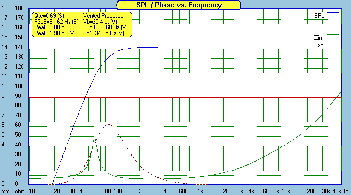 The design enclosure is 14 liters (.5 cu ft) and the measured in-box woofer impedance shows up exactly as modeled. The only real difference is the top end of the impedance curve, since the model doesn't contain enough detail to properly predict the upper end of the impedance of a complex faraday shielded motor. Mainly, the model just has a simple Le rating when there's much more to it than that. Of course I use the measured impedance for designing, so no worries.