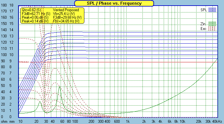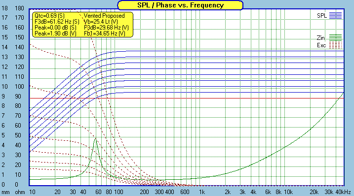 The default design is .5 cu ft sealed, which results in an F3 of about 65 Hz. This is shown in most of the design plots on this page. The image directly above shows the vented options however. In a largish enclosure, we get ridiculously deep bass with the limiting max excursion happening around 50Hz with 30 watts. 15Hz above and below that, power handling increases dramatically. Running full range, don't expect to dump a lot of power into this design, or at least be a little careful if the music has a lot of content in the 50Hz area. A 50 to 100 watt amp is a good match for this speaker. The power handling images show excursion (the dashed brown line) at levels of 1, 2, 4, 8, 16, 32, 64 and 128.