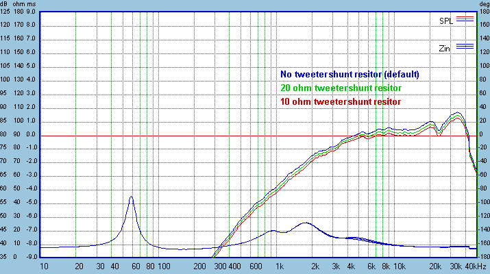Note that subsequent tests of many XT25 tweeters have shown that newer versions are on average 1.3 dB more sensitive than the original version posted. If your tweeters are brand new, purchased from a vendor who has had new stock come in within the last year or so, you may wish to add a shunt resistor across the tweeter's terminals.