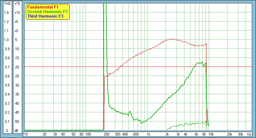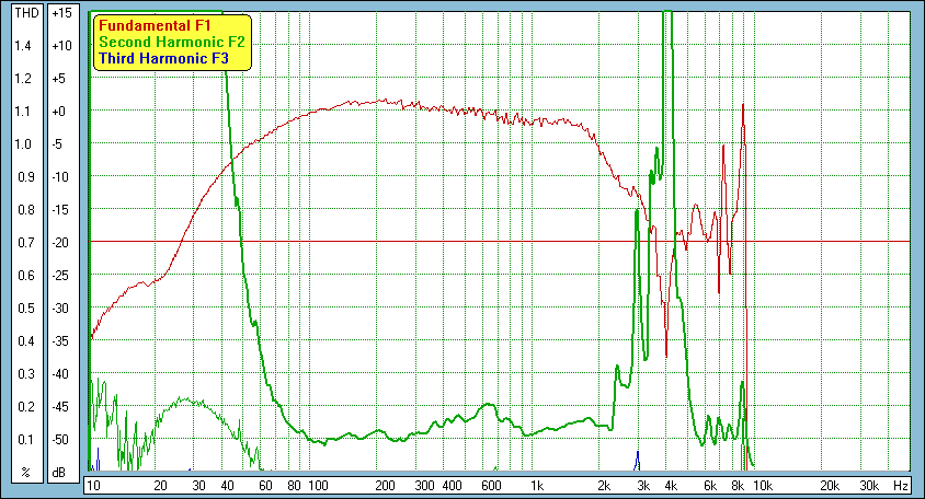 Now, with the L18 H1224's new higher breakup node, you can see in the distortion chart above that the 3rd order harmonic is pushed up to 2.5kHz. This is much more useful in a 2-way design. With the crossover placed at 2kHz, even the harmonic is several dB down, enough to not be noticed anymore. Now you can see why I've been so excited about this woofer.
