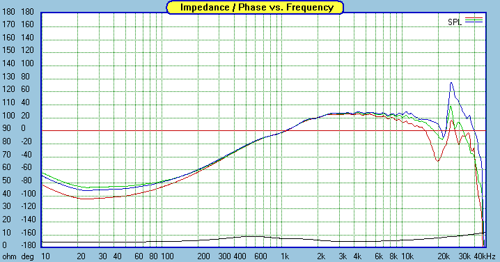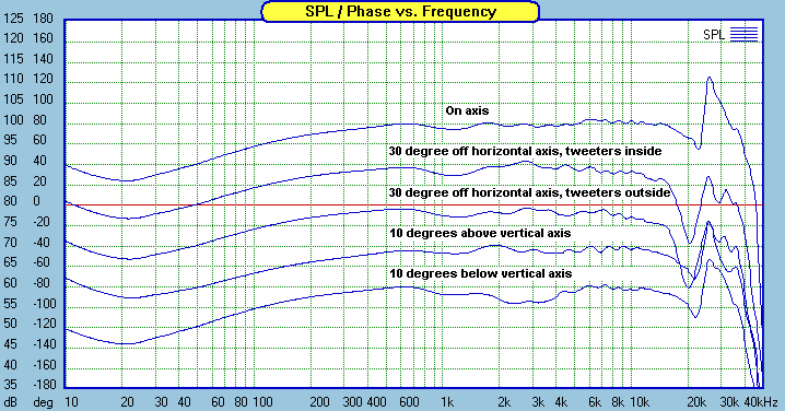 The design axis for this project is ears level with the tweeter, or slightly above. On paper (or on screen) the notch completely kills all breakup. In reality, it doesn't quite work as well as on paper, but still effective enough. The vertical off axis chart is a good estimation of the vertical listening window. Vertically +30/-20 degrees will still result in flat response, by +40/-30 the null has shown up and by +50/-40 degrees the tweeter is completely out of phase with the woofer. The vertical window is by design very tall. This is not a speaker that will lose any of it's midrange when you stand up, and the midrange floor reflection at a typical listening position is reduced from the -40 degree null. It works out well.