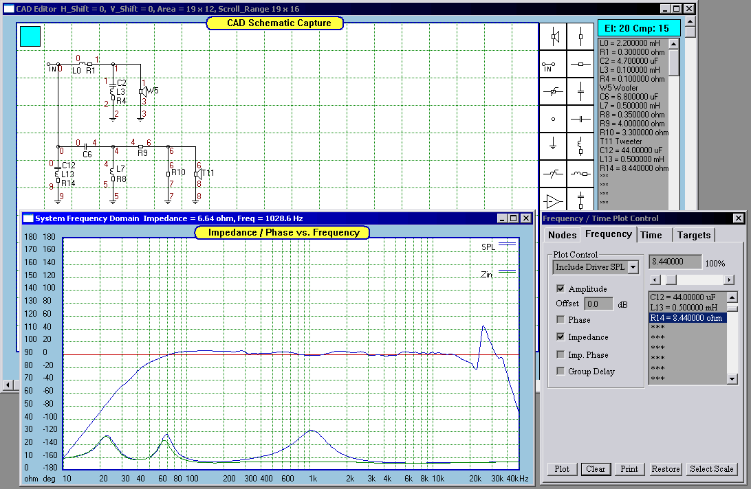 Tweeter lower rolloff adjustment - If you'd like to reduce the output between 2.5 and 4kHz, C6 could be made a smaller value. Default for smoothest response is 6.8 uF, but 5.6, 4.7 and 3.9 are options that increasingly reduce the lower treble output. In a large or highly reflective room, this and/or the response shaping option above may help. Note that as C6 get smaller, the effective listening axis begins to tilt down. Seeing as the vertical listening window is very tall and tilted up a bit by design, you will not have to worry about this.
