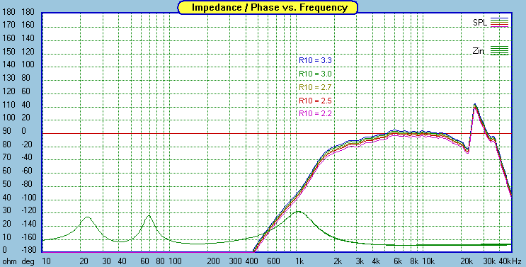 L-pad options - Changes in the L-pad are primarily recommended for compensating driver efficiency inconsistencies. In most cases this will not be needed, and using this for response shaping rather than level equalization will affect the phase alignment at the crossover. Don't underestimate the effect of seemingly minor effects in this area - changes that happen over the entire tweeter range are easily audible. R10 is the modified resistor, while R9 does not need to change.