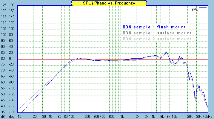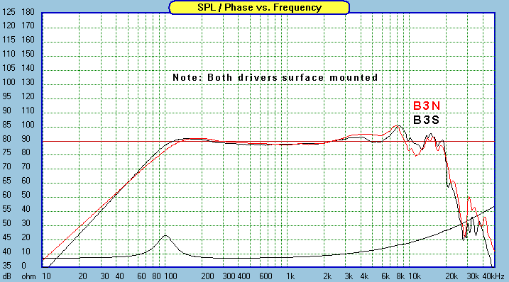 When this project was in the preliminary stage, many people were wondering if the B3N was the same as the B3S. The driver is exactly the same except for the frame. Unfortunately, the frame causes some response differences in the top two octaves. The round flange version has more output in the 5khz region and less output in the 10khz region. Flush mounting the B3N makes a minor difference in the 2khz region, and in general it does not have to be done with this driver.