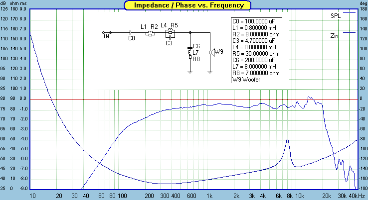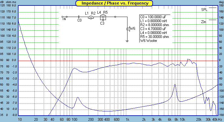 A plate amp speaker level output usually has a "1st order" high pass which is essentially just a 100 uF cap. This woofer has a fairly sharp impedance peak at it's resonant frequency. In this box, at this exact enclosure volume, the impedance peak is around 130hz. In the schematic, C0 represents the 100 uF cap. When you combine the impedance peak with the cap, what you get is a huge, sharp peak in the response as shown in the image above.