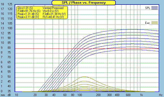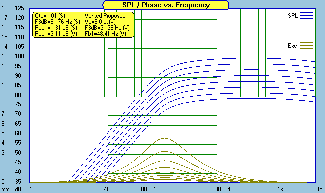 With teeny weenie drivers like this, nothing is of bigger importance than power handling. The charts above are power doubling, starting at 1 watt, then 2 watts, then 4 watts, and on up to 128 watts. Careful, the 3mm Xmax shows up quickly. Running full range, don't expect to pump more than a few watts into it. You will exceed Xmax with 8 watts at 90hz. A Sonic Impact T-amp would make a nice combo for a nearfield or low level listening system. But for home theater or any other "room filling" sound, you had better start paying attention to the subwoofer crossover if you expect to get any reasonable loudness out of this system. Note: Thanks to John Kreskovsky for showing me how to set up filters in the Soundeasy enclosure design module so I can accurately look at Xmax issues when used with a sub.